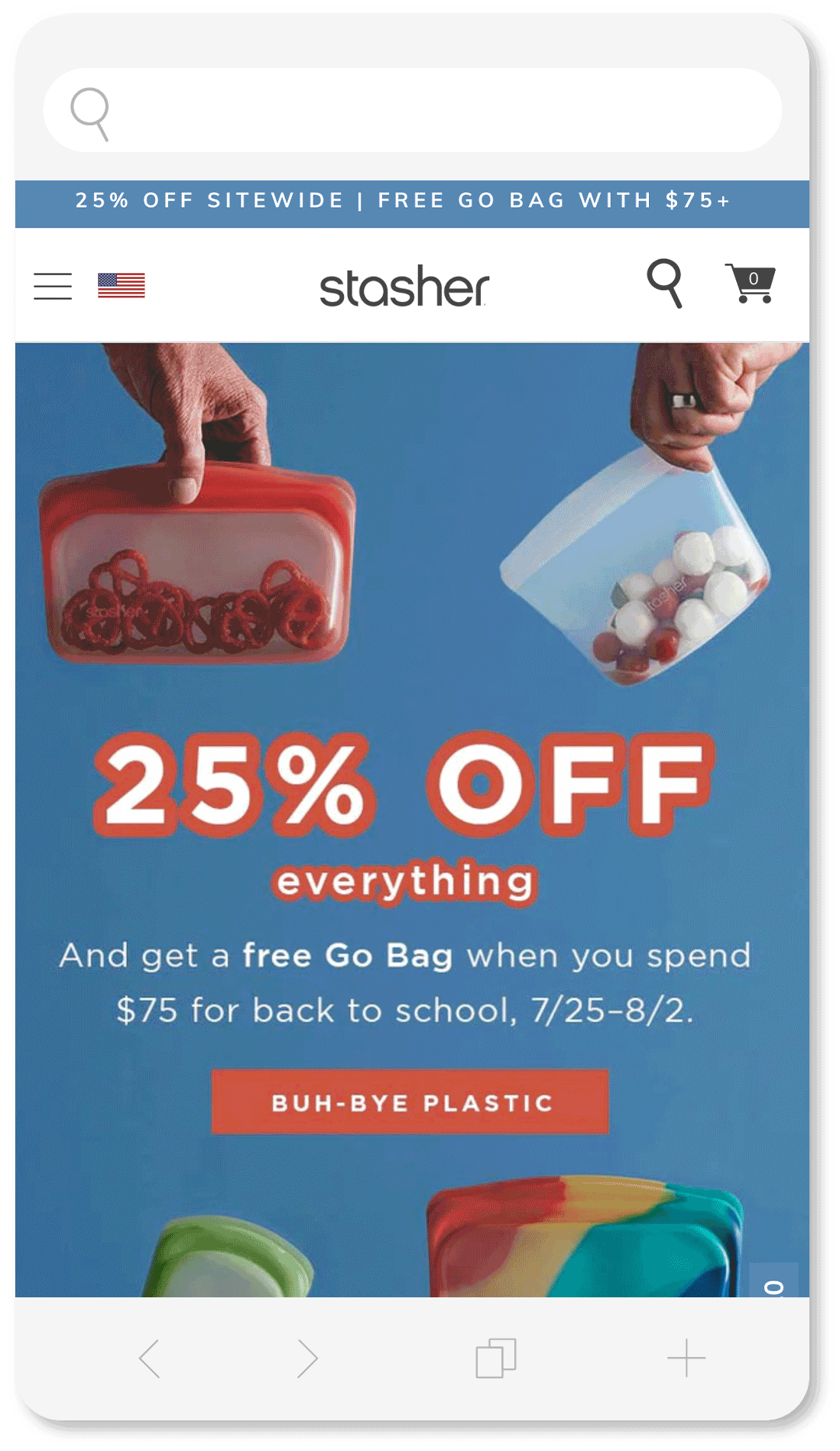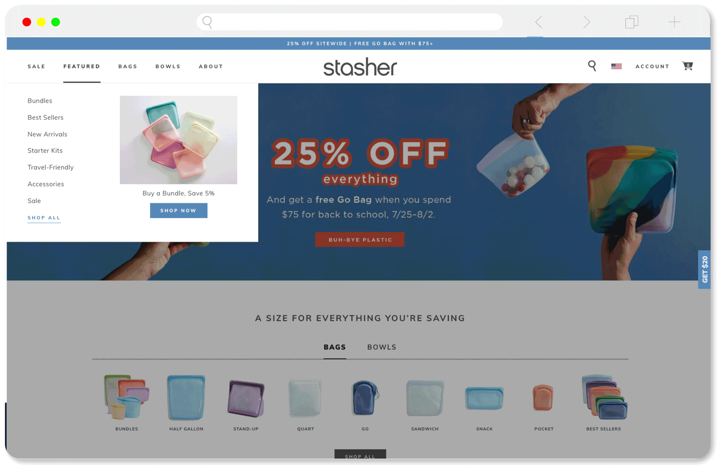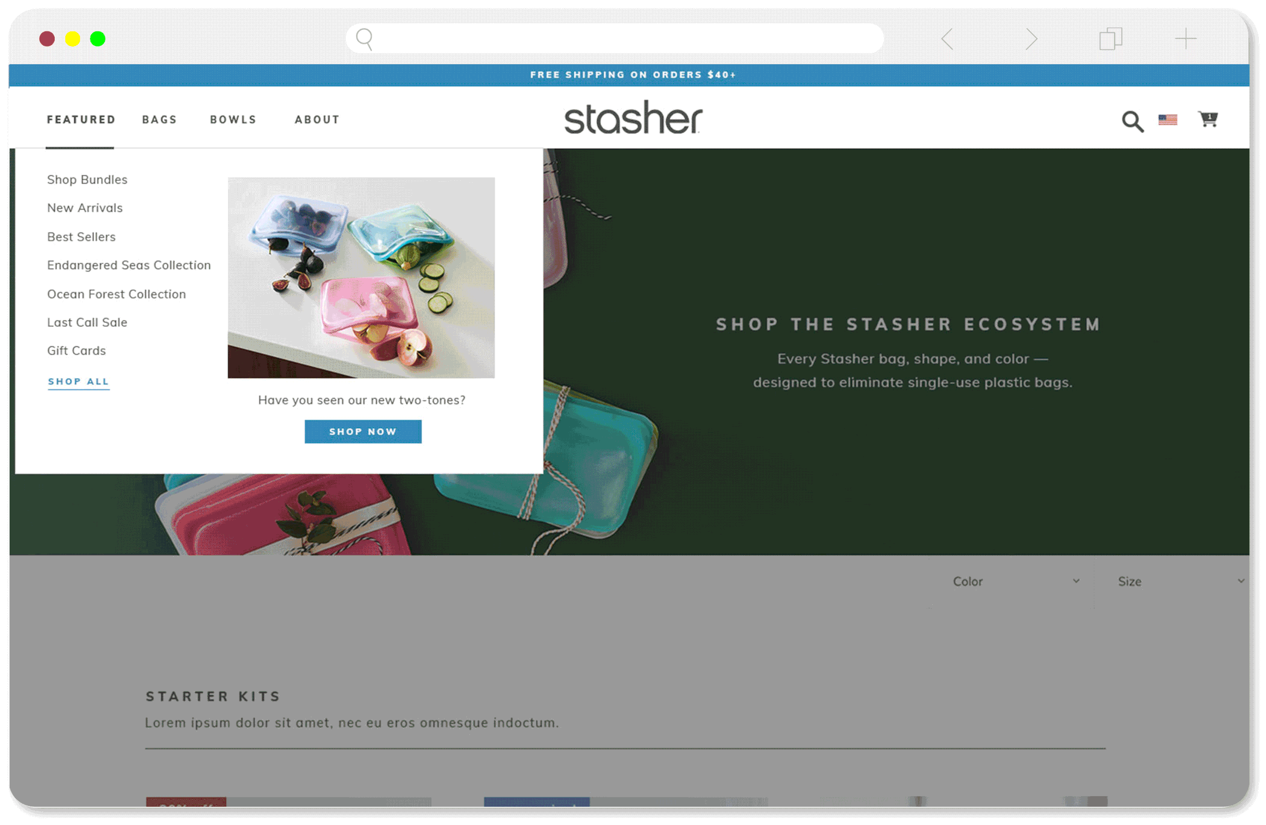 Redesign the DTC top navigation to allow for the launch of Stasher Bowls, the first completely new product since Stasher launched with bags in 2016. First we needed to create room for a new product at all, and help the customer understand how this product related to our original product line of bags. Secondary wishes included the ability to feature products, better organize information, and clearly guide users while being mindful to not create decision paralysis.
